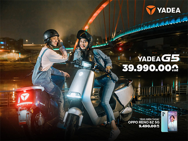 Một món quà cực khủng từ hai thương hiệu xe máy điện và điện thoại hàng đầu thế giới. Khi mua xe máy điện YADEA G5, tặng ngay một điện thoại OPPO Reno 6Z trị giá 9.490.000 VNĐ. Mẫu xe G5 thuộc phân khúc xe máy điện cao cấp, trang bị các tính năng thông minh vượt trội.