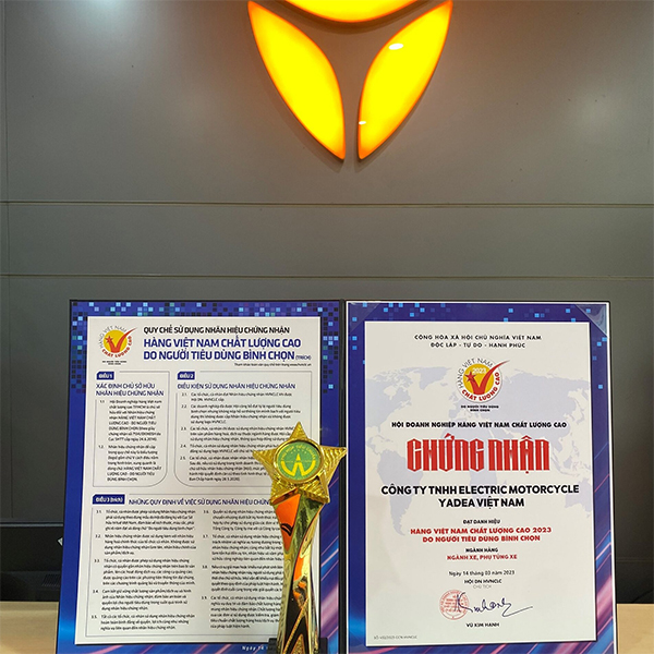 Ngày 14.3.2023, Công ty TNHH ELECTRIC MOTORCYCLE YADEA VIỆT NAM vinh dự đạt danh hiệu Hàng Việt Nam Chất Lượng Cao do người tiêu dùng bình chọn: ngành hàng xe và phụ tùng xe.